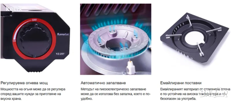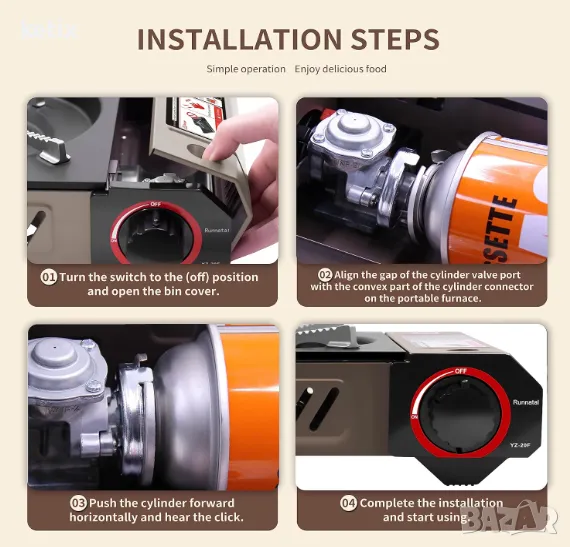 Приложими газови бутилки – приложими газови бутилки за къмпинг печки на открито: 150g, 220g, 250g стандартни/международен стандартни бутилки с течен бутан (продават се отделно). Мощността на горене на газовата печка е 3300W (2800kcal/h), което означава по-голяма огнена мощност, по-дълго време за непрекъснато горене, спестяване на време и газ.