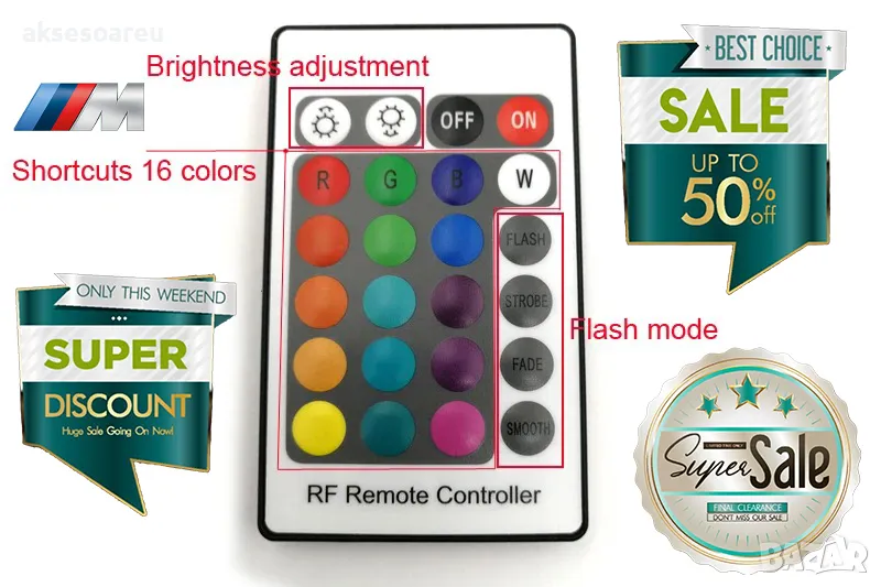 3) Дистанционното с RF led контролер, има 24 бутона, като функцията им е изобразена навсеки бутон.