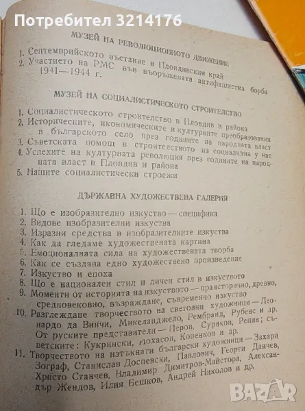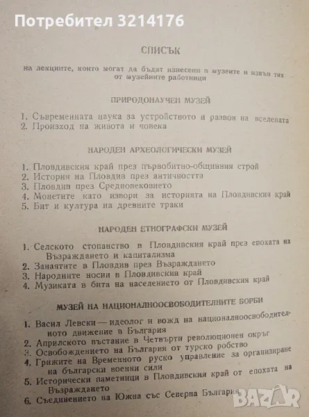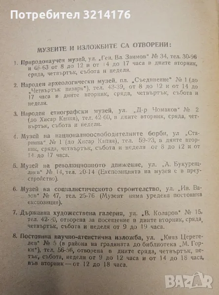 Музеите в нашия град – Пловдив. Природонаучен. Народен археологически. Народен етнографски. Музей на националноосвободителните борби. Музей на революционното движение. Музей на социалистическото строителство. Държавна художествена галерия. Постоянна научно-атеистична изложба (издание от 60-те)