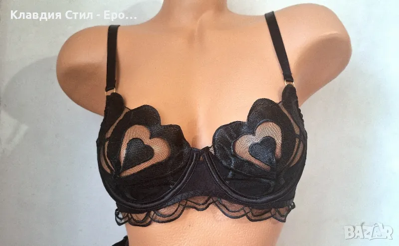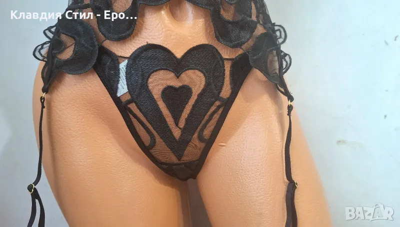 Уникален красив комплект еротично дамско бельо, включва прашка, сутиен и жартиерен колан с атрактивен секси дизайн, изработен от фин прозрачен тюл с бродирани акценти с форми на ефектни сърца. Материята е фина, еластична и комфортна.Придава изключително женствено и сексапилно чувствено излъчване.Разгледайте и другите ми обяви с еротично бельо и фетиш модели и изберете съчетание за Вашия предпочитан еротичен