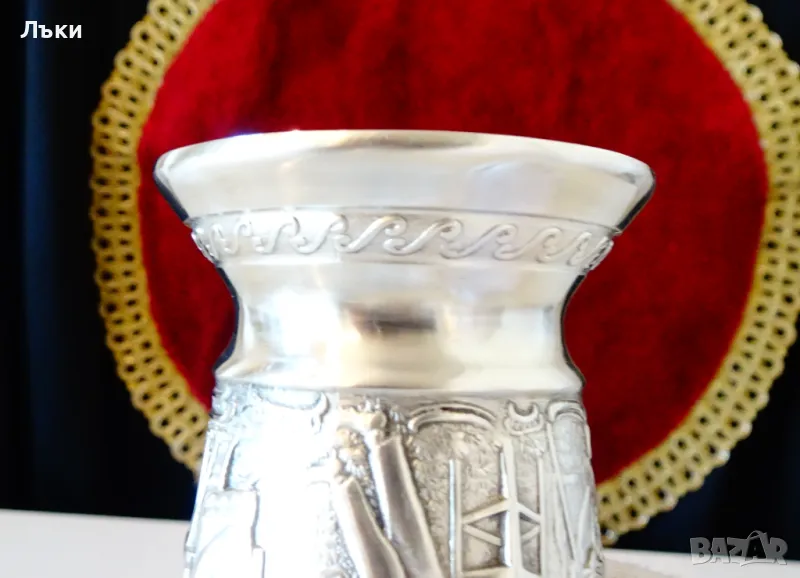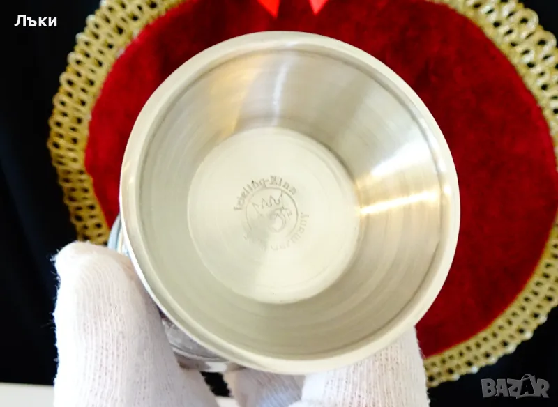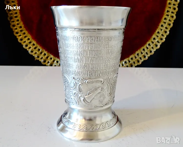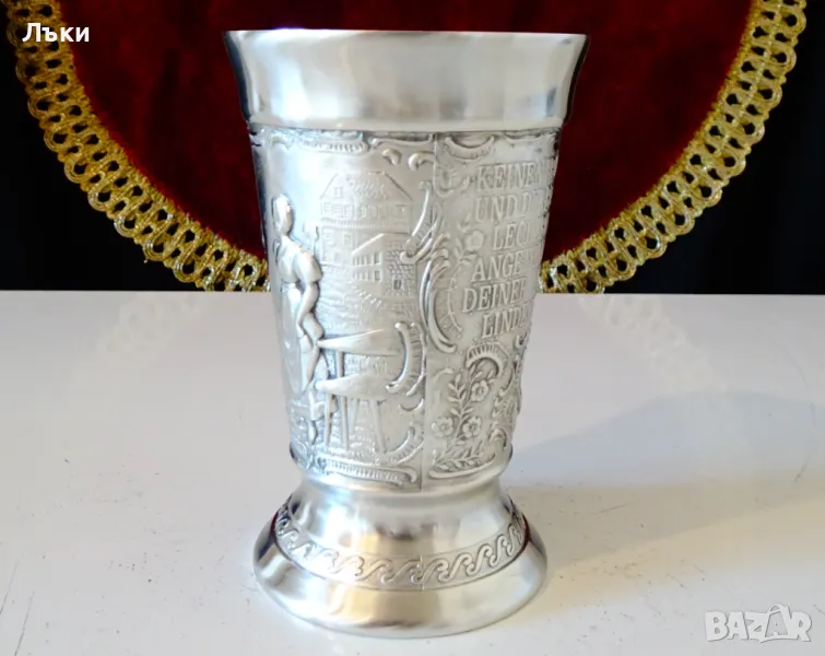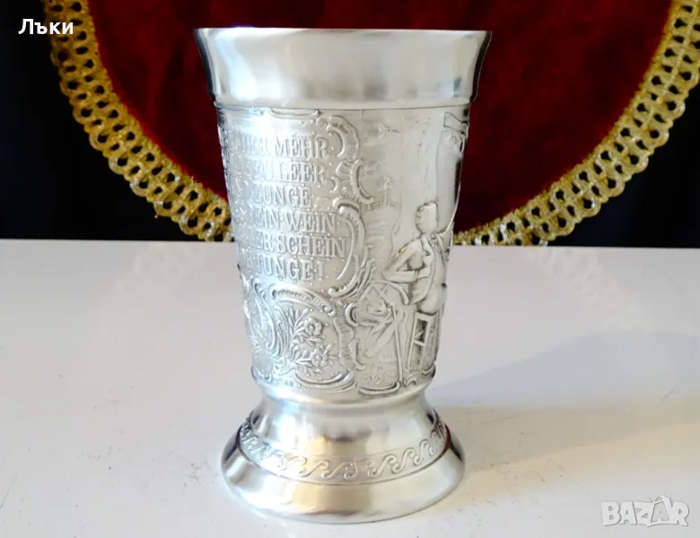 изработка от 95% калай и 5% сребро, маркирана със знак за високо качество.Декорирана с релефна картина,вдъхновена от немската любовна песен ”Die Lindenwirtin” - „Нито една капка в чашата”. За какво се разказва е описано с релефно гравирания текст: