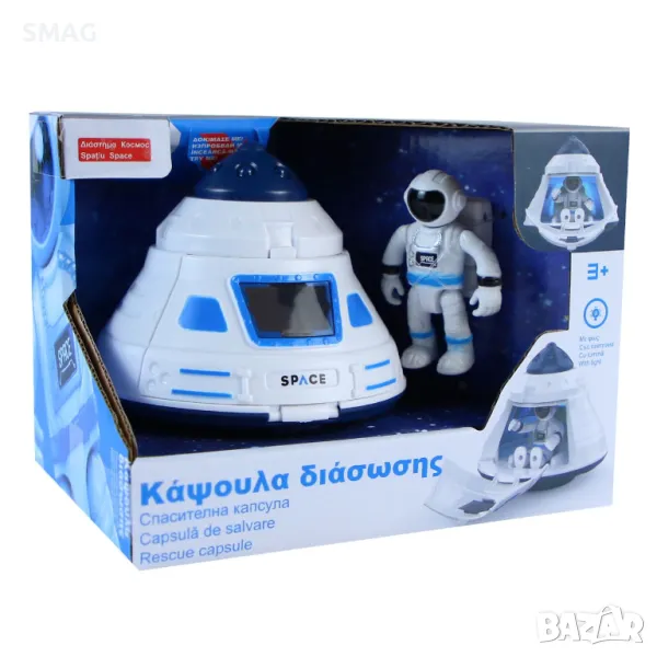 Космическа спасителна капсула - пилотска кабина с астронавт. Вратата се отваря и астронавтът може да навигира в космоса. Работи с 3 батерии тип AG13 (включени).