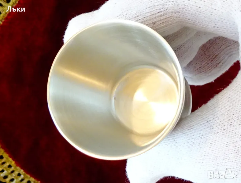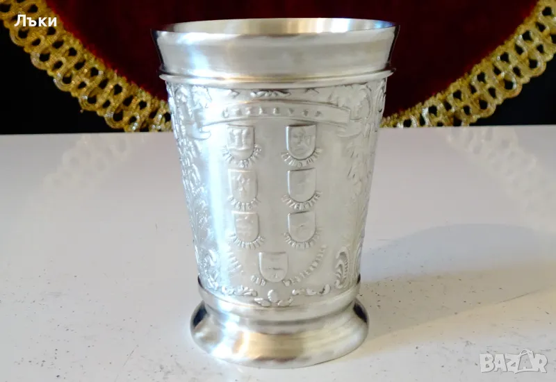 изработка от 95% калай и 5% сребро,маркирана от производителя като патентован модел.Декорирана с релефни немски гербове и красиви орнаменти.Височина 6 см.,диаметър 4.5 см.,тегло 60 гр.Вместимост 50 мл.