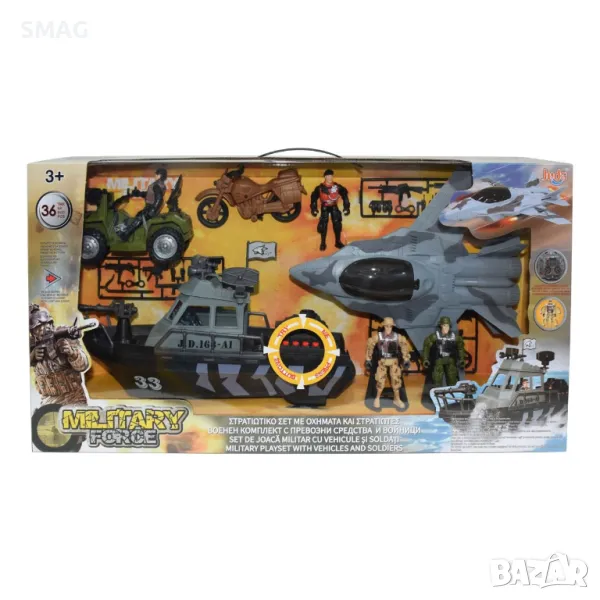 Комплект военен боен кораб с реалистични бойни звуци и светлини. Заедно със самолет, джип и мотоциклет, оръжия и войници. Работи с 2 батерии тип AG13 (включени).