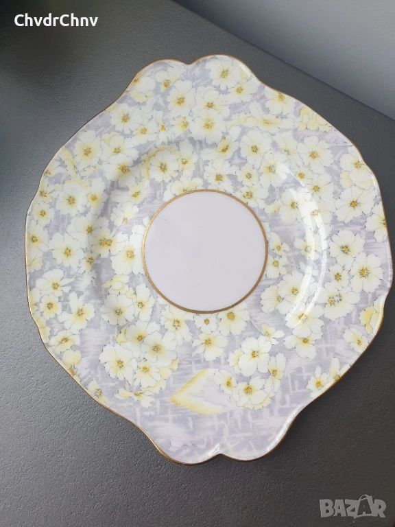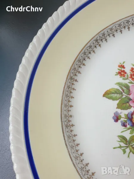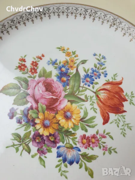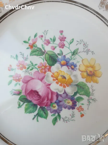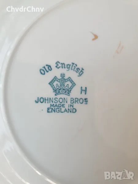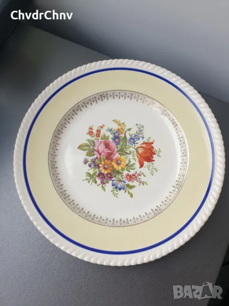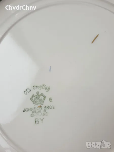 (ЧИНИЯ 1 / ДЖОНСЪН БРОС) Диаметър 20 см, с 22К позлата, маркировка/печат отдолу, в добро за годините си състояние. Има минимални протривания по канта и три малки чипчета отдолу, в близост до периферията (не се виждат отгоре), без драскотини по рисунката. Производство Англия 1920-те г.