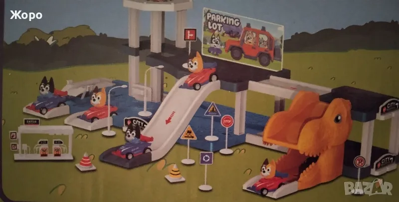 голямата писта с паркинг на Блуи .Играчката включва лента за спускане и 2 коли , бензиностанция и много пътни знаци и много нощни лампи , която поотделно или в комбинация с други играчки и коли увеличава креативността и координация на детето и забавлява и занимава го часове на ред
