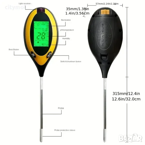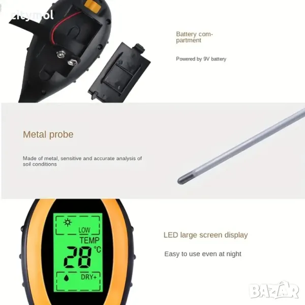 Тестерът може да се използва за отчитане на pH, влажността и температурата на почвата, както и слънчевата светлина. Използвайте превключвателя на гърба, за да изберете дали искате да измервате характеристиките на земята или слънчевата светлина. Резултатите могат лесно да бъдат прочетени на LCD дисплея на устройството, а не на скала, както в случая с класическите устройства. За да изберете скалата на Фаренхайт или скалата на Целзий, използвайте превключвателя вдясно. Тестерът е компактен, лесен за придвижване както отвън, така и отвътре.