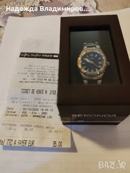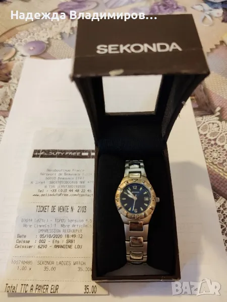 Продавам добре запазен дамски кварцов часовник SEKONDA, с японски механизъм. Купен на голяма промоция от Франция. Със сменена батерия и двойно осигурително закопчаване.