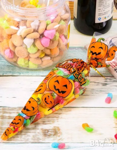 50 бр дълги триъгълни тиква Хелоуин торбички целофан с телчета за дребни сладки лакомства подарък → Обява 48045814
