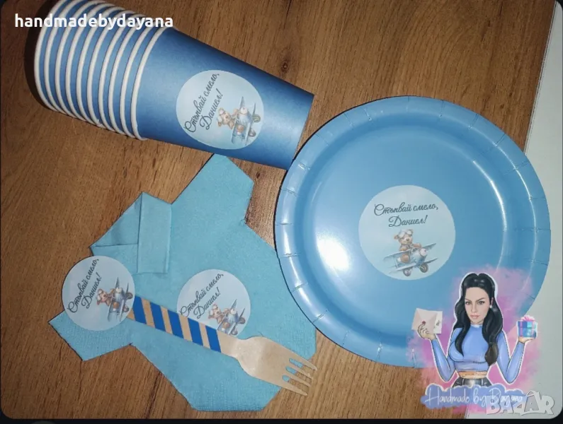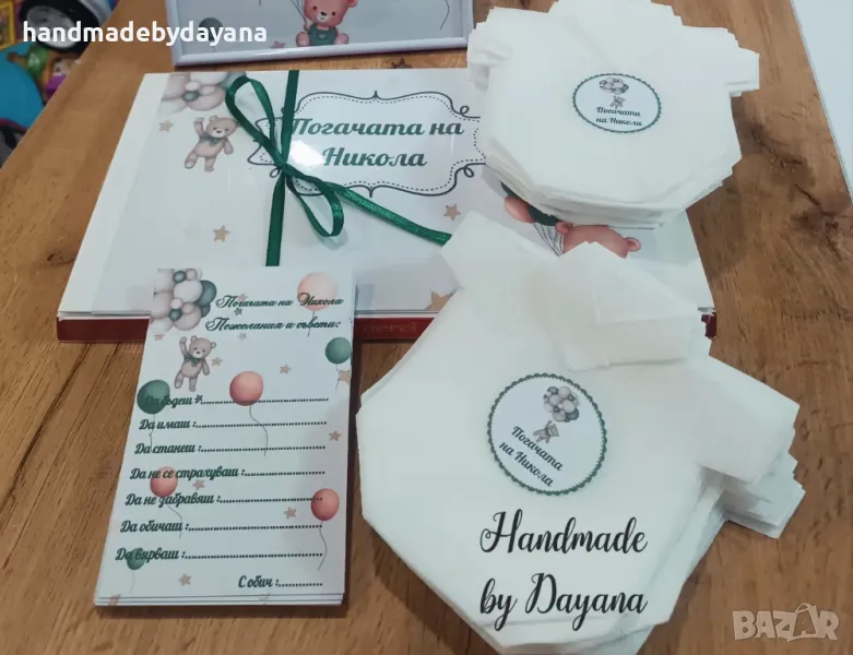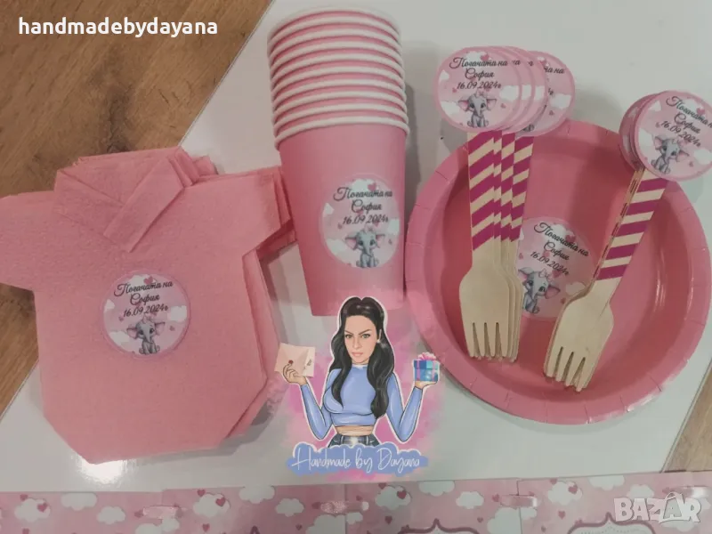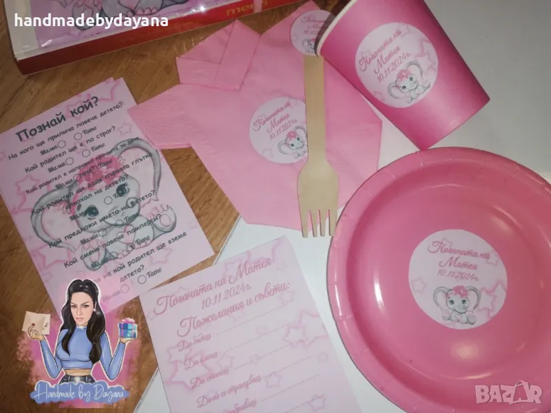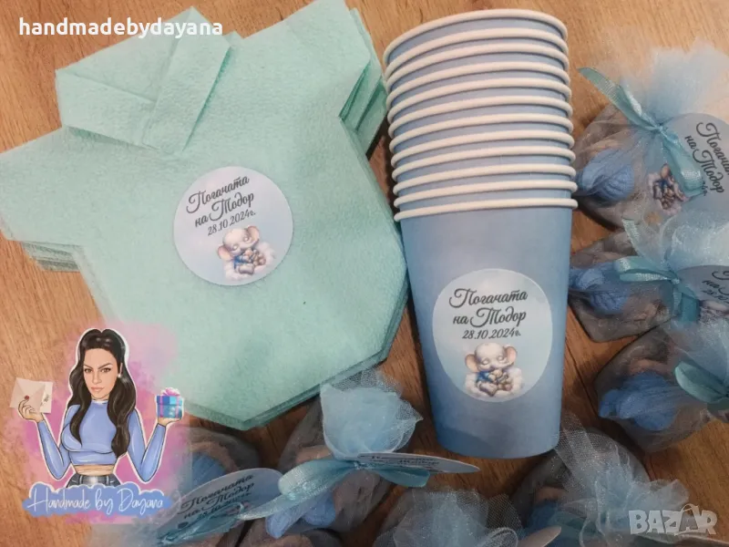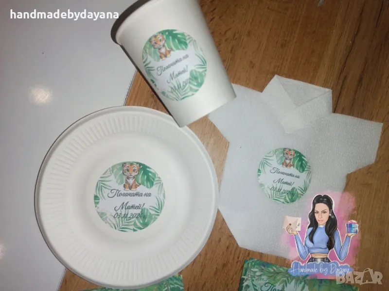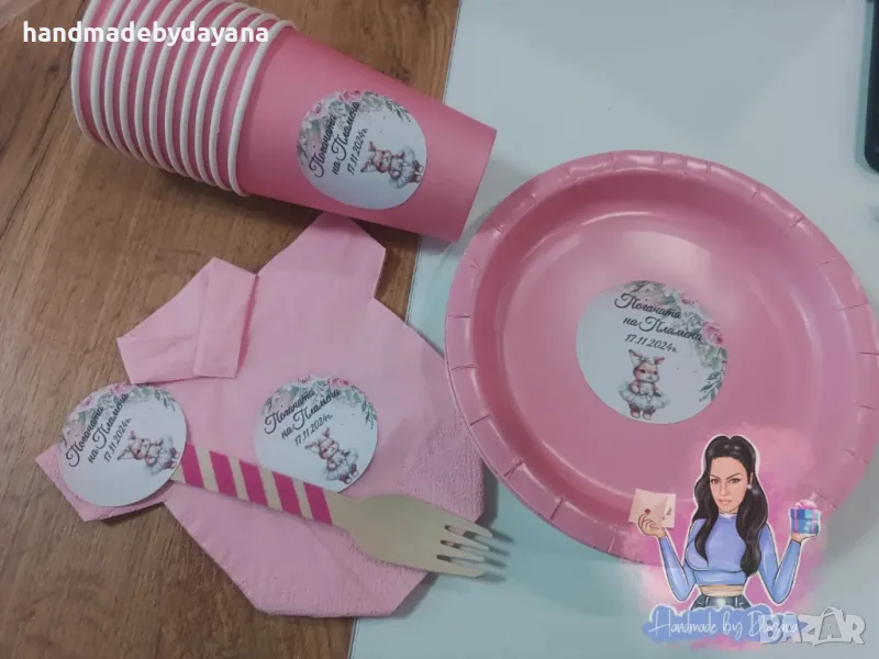 Чашки, чинийки, вилички и салфетки във формата на боди с декорация → Обява 48048602