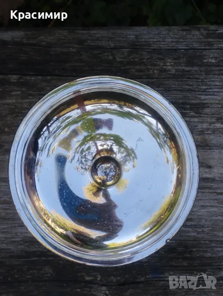 В много добро състояние е без драскотини или пукнатини. Той е с размери приблизително 11 см. в диаметър и 9 см. височина с капака.