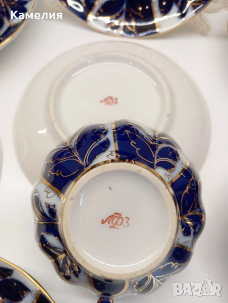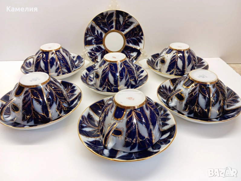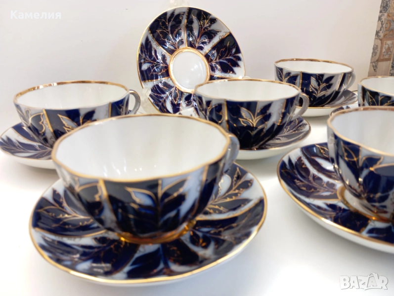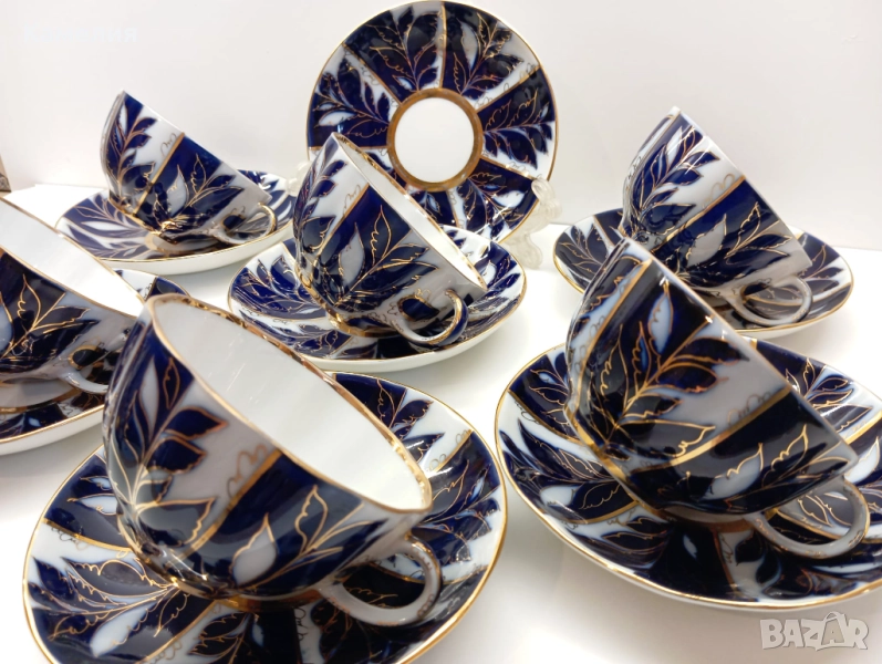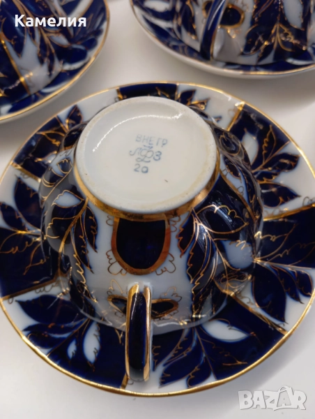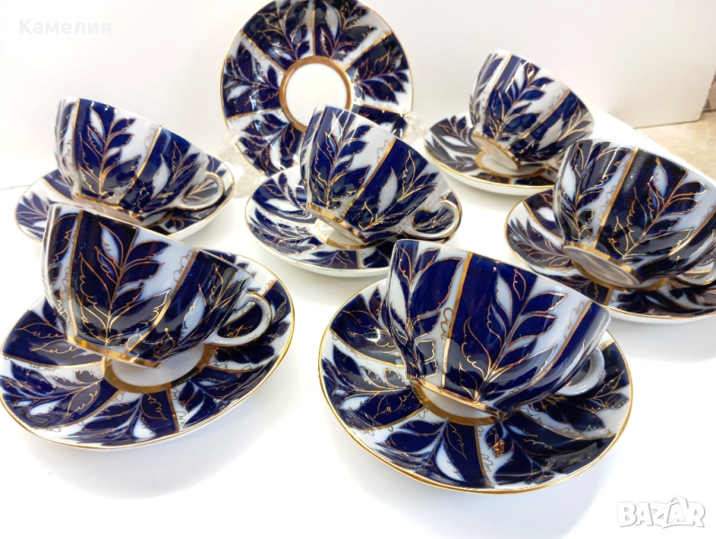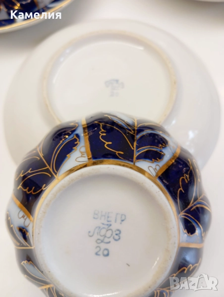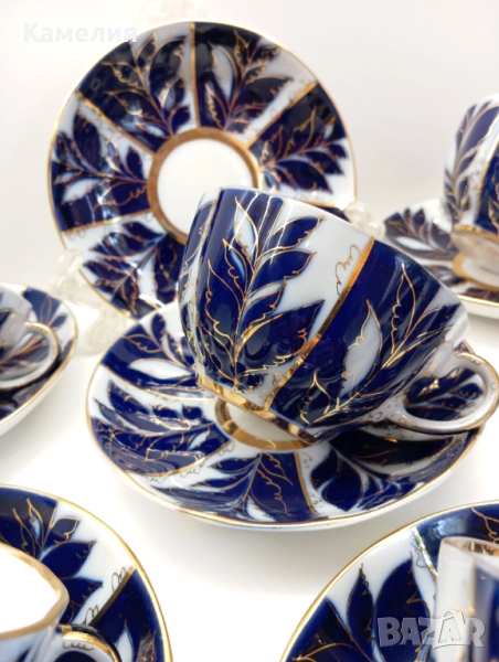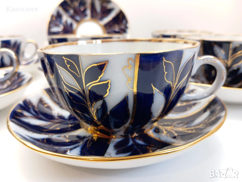 Происход СССР. Кобалт, ръчно рисувано злато. Чаша 250 мл, чинийка 15 см.