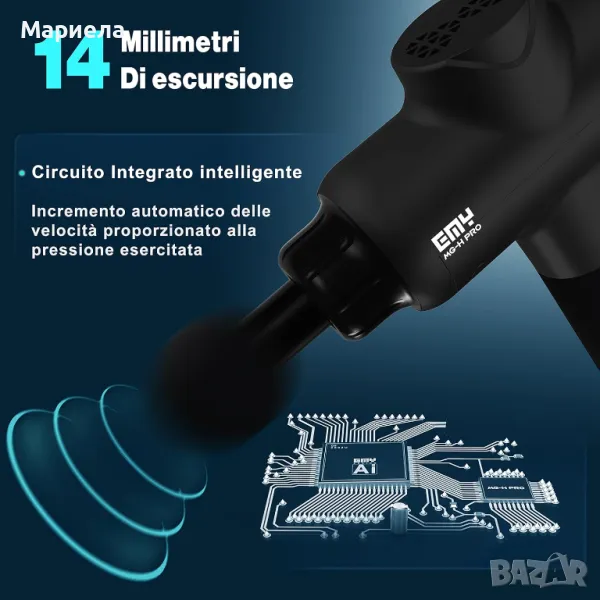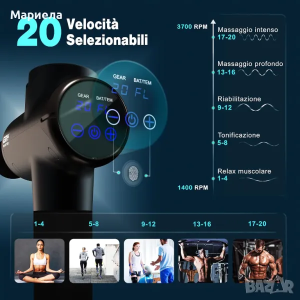 MG-H-PRO мускулен масажен пистолет, който ви позволява самостоятелно да извършвате дълбок и ефективен масаж. Идеален за мускулни болки след тренировка, мускулни контрактури, насърчаване на кръвообращението и за релаксация. Регулируема скорост от 800 до 3700 удара в минута, 20 настройки, избираеми директно от дисплея и дълбочина от 14 mm. Компактен масажен пистолет, с изискан дизайн и лесна за боравене дръжка.