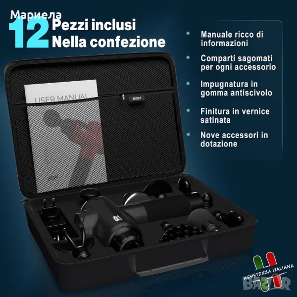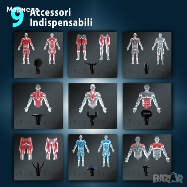 В удобния калъф ще намерите 9 различни сменяеми глави, всяка от които е проектирана за конкретна нужда: сферична глава, плоска глава, вилица, глава на бик, палмова глава, полукръгла глава, глава с шест пръста, студена Глава и накрая нагревателна глава: иновативна глава, която се загрява бързо, за 10-20 секунди с регулируема температура между 35°C и 65°C, главата се захранва самостоятелно от батерията на пистолета през конектора.