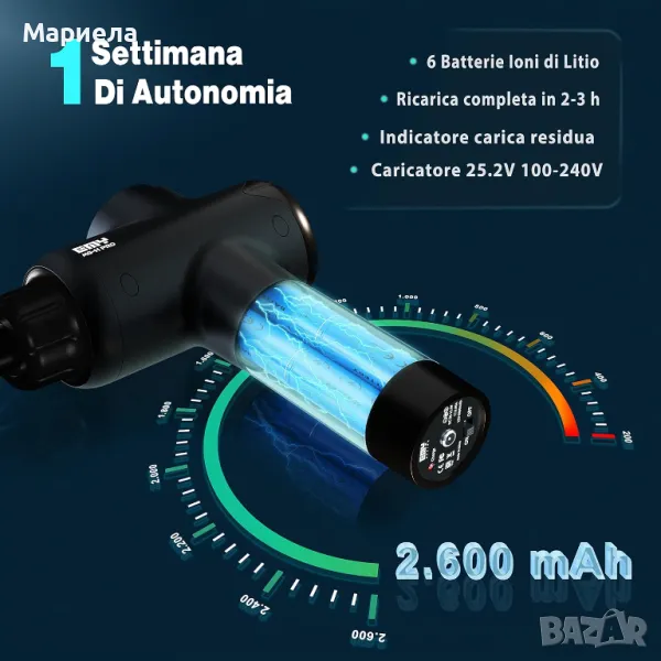 Благодарение на високата мощност и 14 mm отклонение, масажният пистолет MG-H PRO ще ви гарантира отлични резултати. Оборудван с 6 батерии 18650 за общо 2600 mAh и мощност 24V, акумулаторни батерии с адаптер, включен в опаковката. Време за зареждане 3-4 часа.