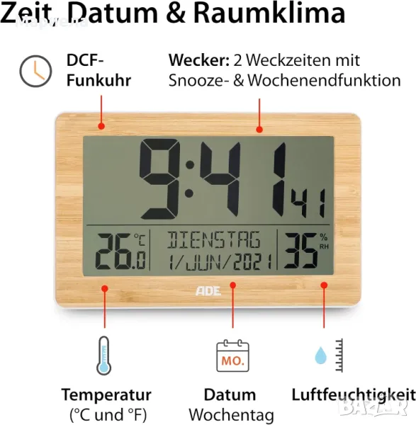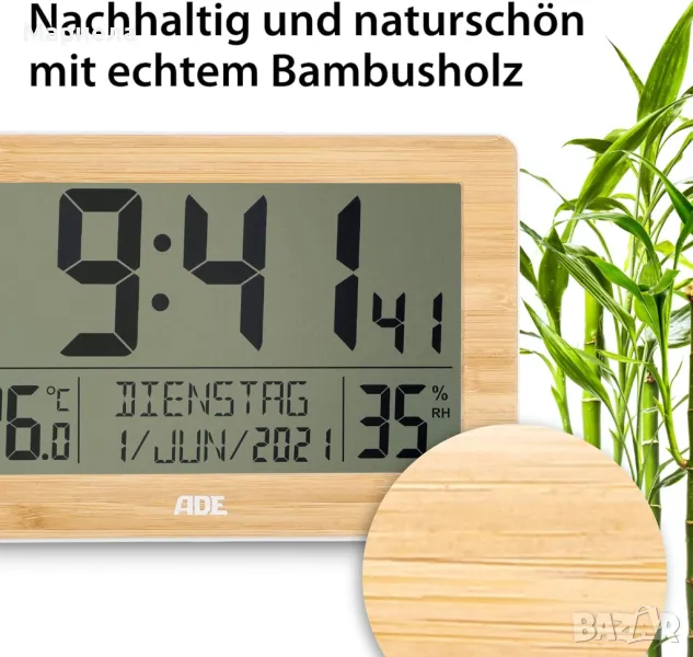 Цифров настолен часовник с естествена бамбукова рамка / Стенен часовник с двойна аларма, термометър