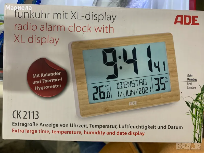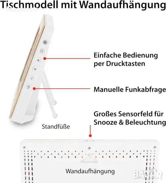 Безжичен настолен часовник с термометър и календар за показване на дата и ден от седмицата. Със стойка за използване като настолен часовник, идеален за възрастни хора.