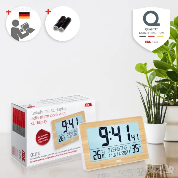Този цифров настолен часовник с голям, ясен XL LCD дисплей (19,3 x 10,9 см) с подсветка с натискане на бутон (за прибл. 8 секунди). Показва час, стайна температура, дата, ден от седмицата и влажност.