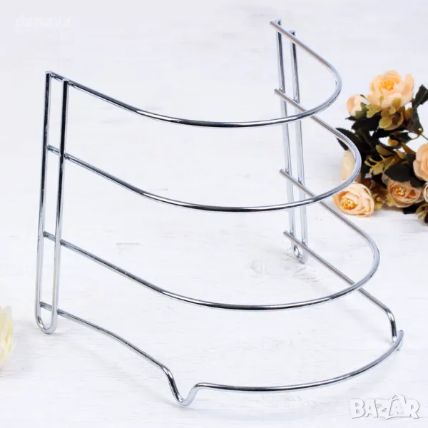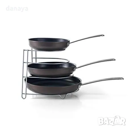 Метален органайзер за тигани на 4 нива. Стабилна метална стойка, която може да се постави в кухненският шкаф. Органайзер за пестене на място, с който всичко ще е подредено и винаги под ръка. Свободно стояща поставка за тигани, тави или други кухненски съдове, която не изисква монтаж.