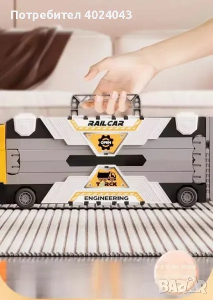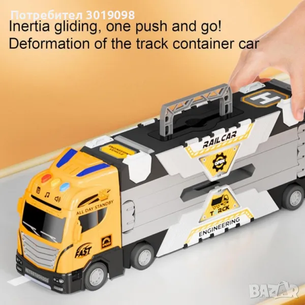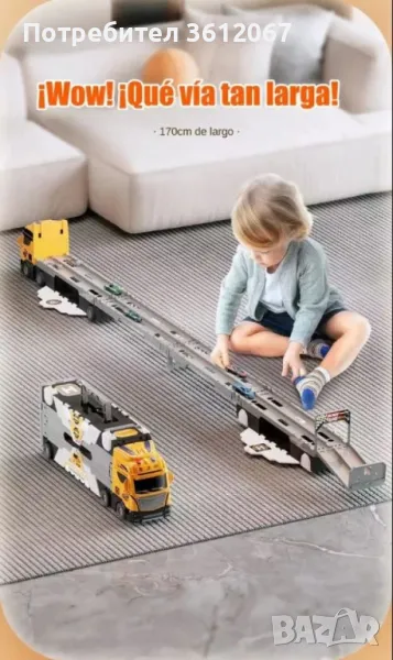 Препоръчителна възраст: Над 3 години;Брой части: 7;Материали: Висококачествена пластмаса и сплав;С устройство за изстрелване на колички;Със звукови и светлинни ефекти;Включена автомобилна писта;Включени 8бр. състезателни количкиРазмер на пистата: 170 см;Размер на камиона: 46см х 10см х 16.5см;Размер на кутията: 50см х 12.5см х 28.5см;Тип батерия: AA (не са включени в комплекта).