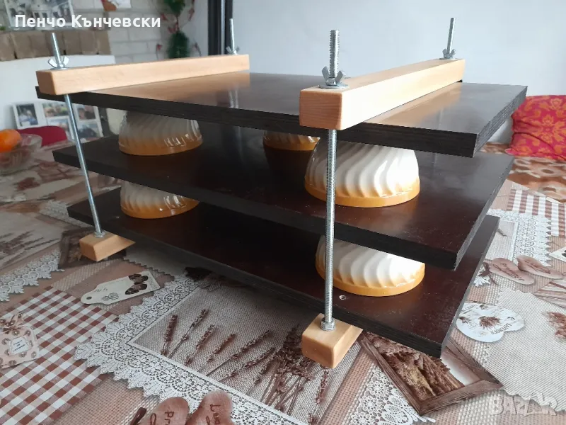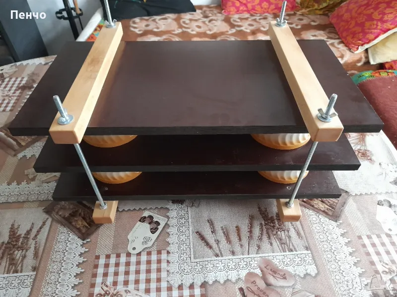 Производство на преси от висококачествен водоустойчив Буков шперплат за всякакви месни продукти. Размери на плотовете 62×32×2см.