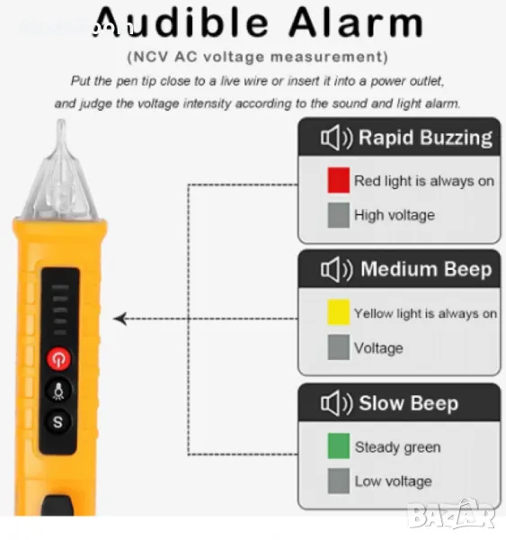 Този безконтактен детектор за напрежение е идеален за бързо и безопасно откриване на променливо напрежение (AC) в диапазона от 12 до 1000V. Той е подходящ за електротехници, монтажници и домашни майстори за проверка на електрически вериги, контакти и проводници.