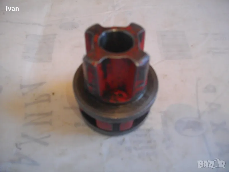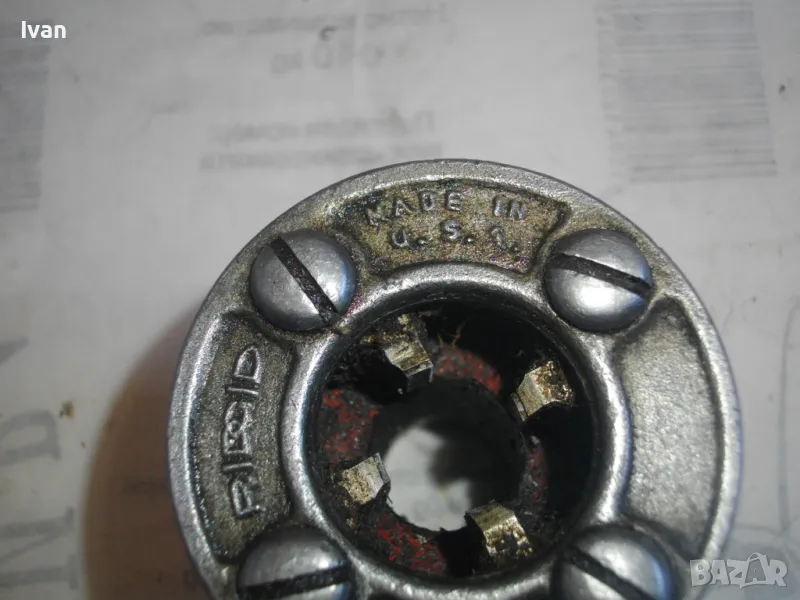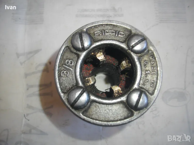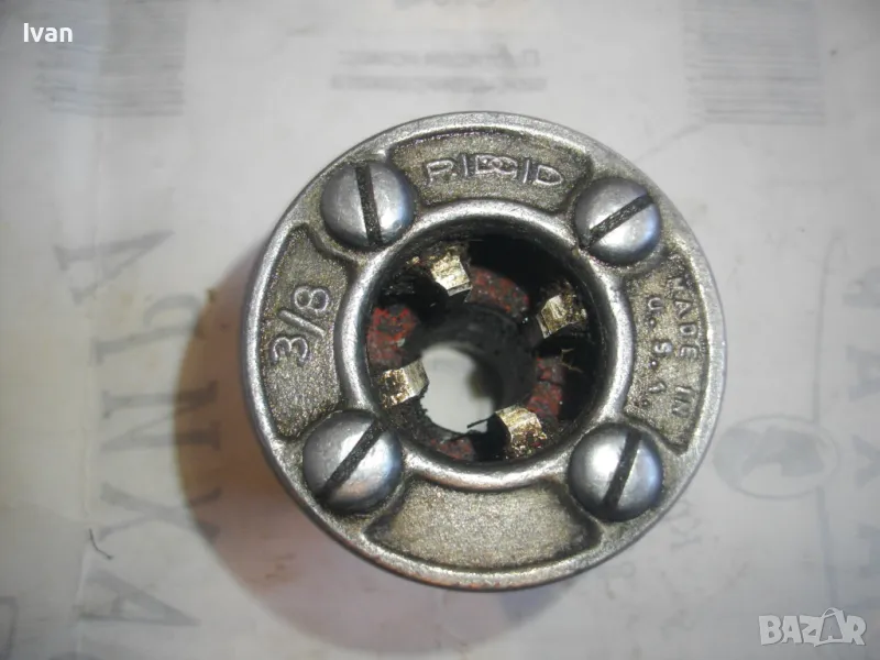 Резбонарезна глава на РИДГИД за винторезка винтонарезка водопроводна, плашка, пафта за направа и ремонт на резби на стомавнени тръби, размер 3/8 цол. Оригинална американска на марката. Марка, маркировки - RIDGID Ridgid Trade Mark Made in USA. Почти нова, в отлично рабтно състоняие, без никакви наранявания по зъбите на резбонарезните ножове. Стандарт универсален BSPT. Дясна резба.