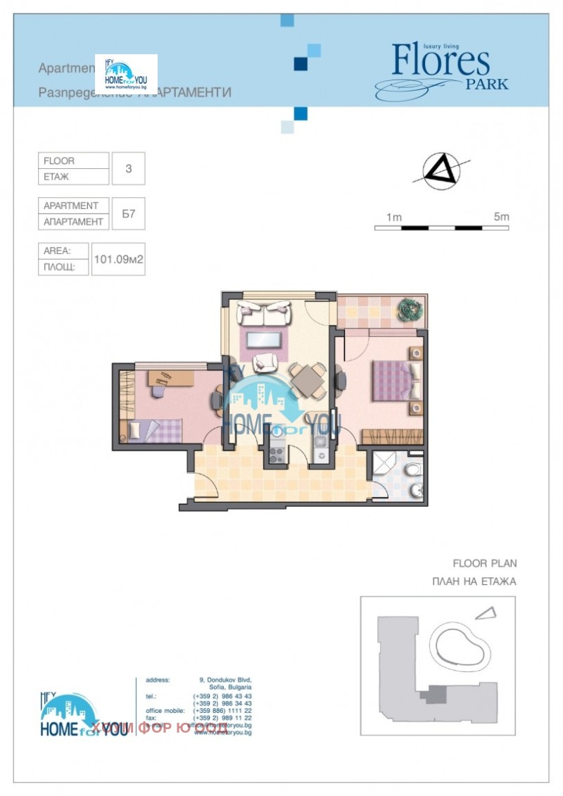 Апартаментът се намира на 3 етаж с южно изложение. Общата площ на апартамента е 101,09 квадратни метра.