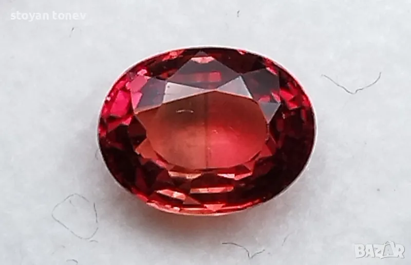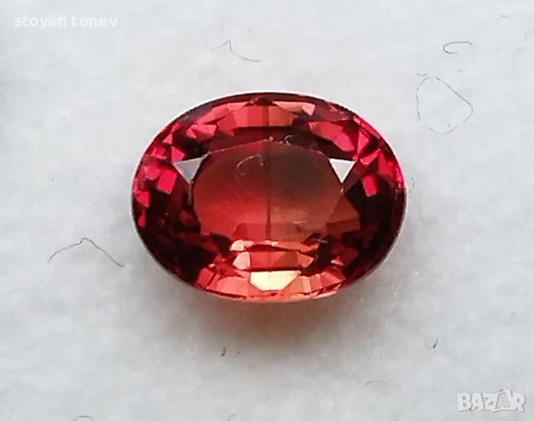 без видими свключения. Цвета е червеникаво оранжев. Овална форма с размери: 8 x 5 x 3 mm.