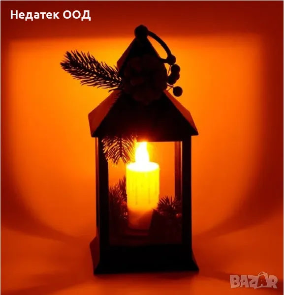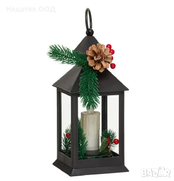 Коледен декоративен фенер пластмасов черен с LED свещ и клонка отвътре, елхова клонка и шишарка отвън. Има бутон On/Off и пластмасов пръстен. Работи с 3 батерии AAA (не са включени).