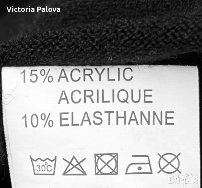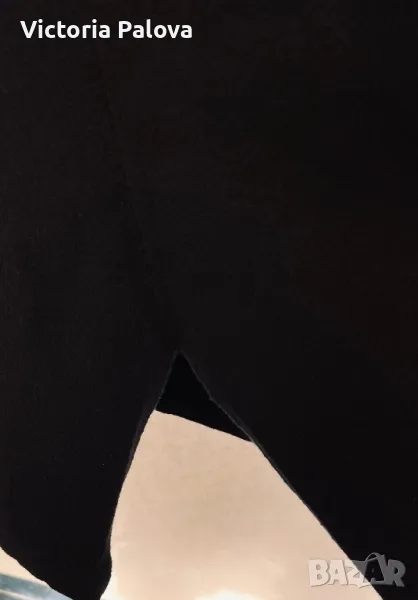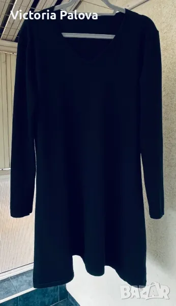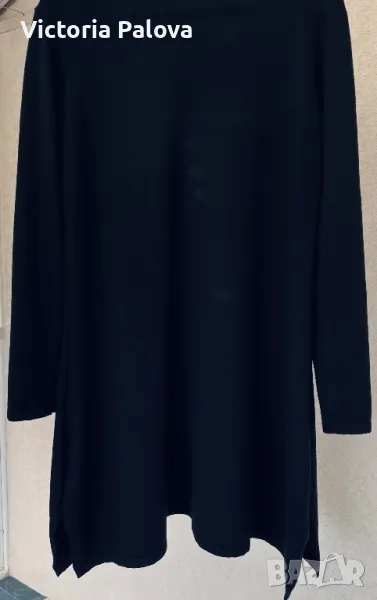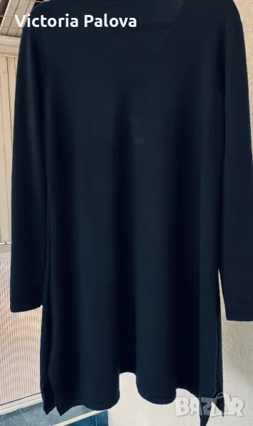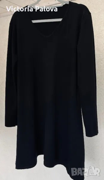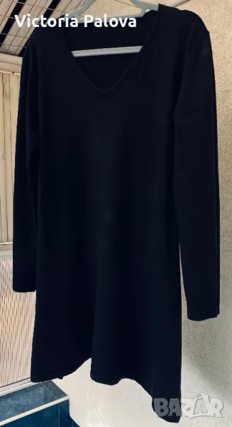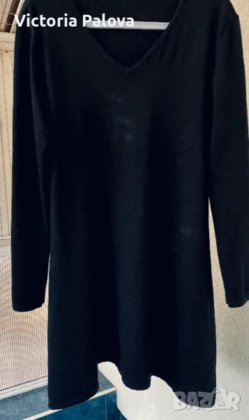 Черна рокля ( или дълга блуза) с малко V-образно деколте, минималистична, от кръста надолу се разширява , отстрани цепките са по 20см. Мека приятна материя - състав от вълна, коприна, кашмир, акрил и еластан ( има разтегливост). Рамо - 46-48см, ГО - 55см, дължина - 92см, ръкав - 60см.