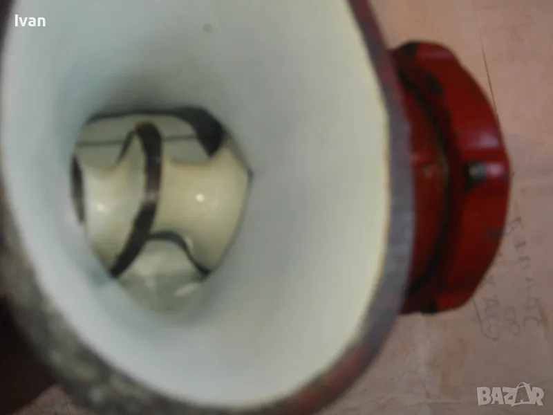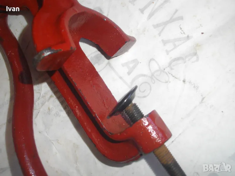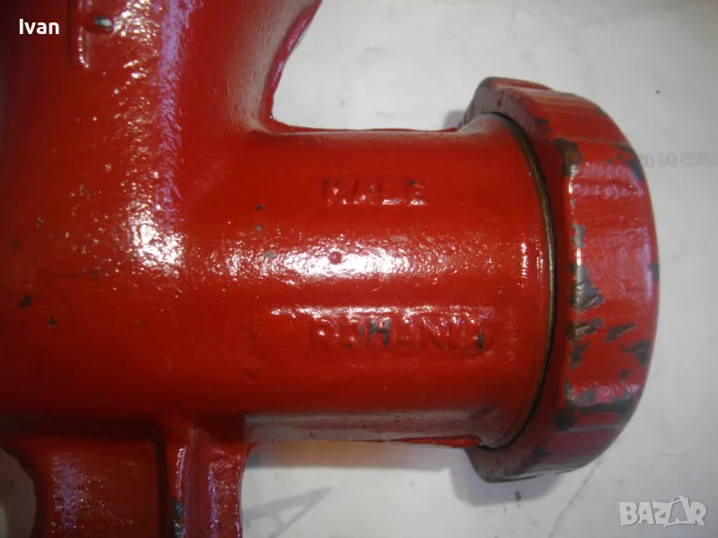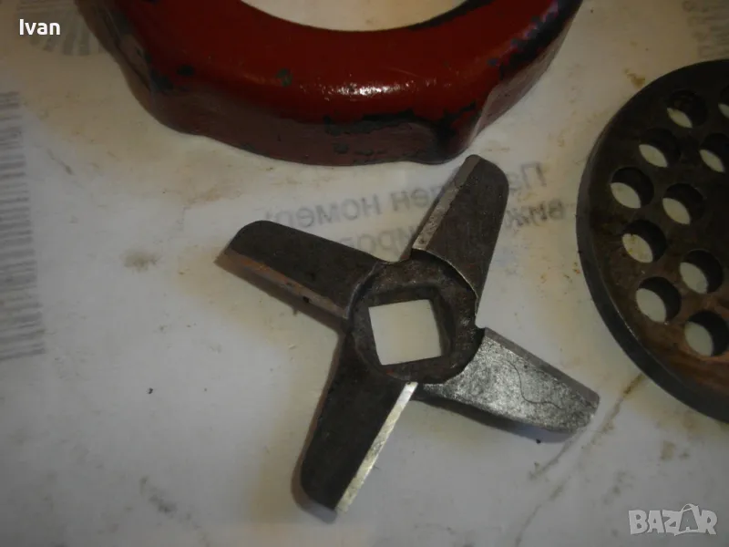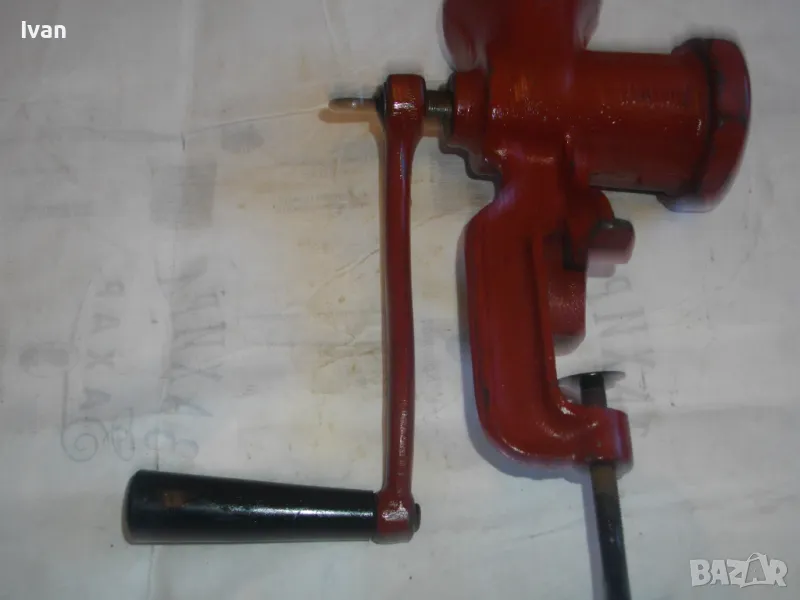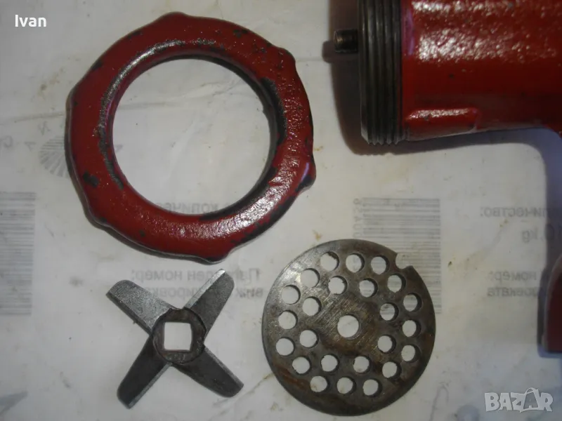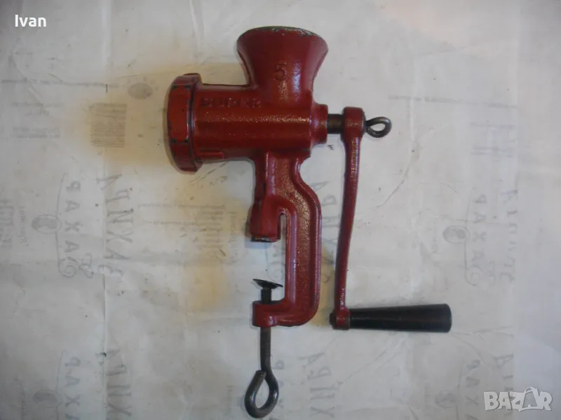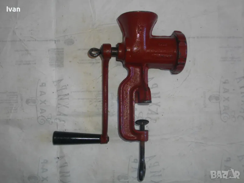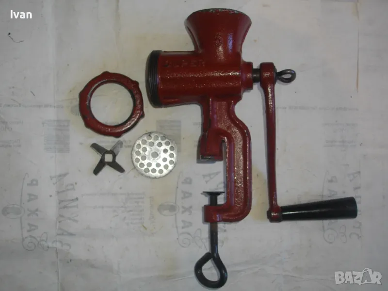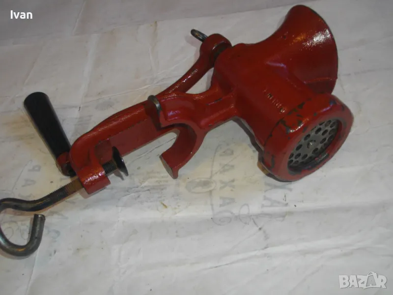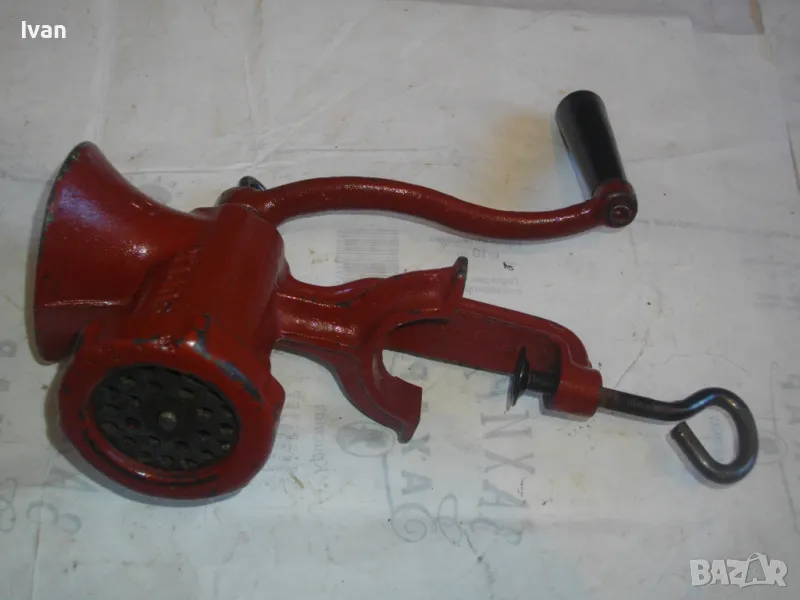 ОПИСАНИЕ на червена месомелачка - 139 лв. Румънско маркирано Соц производство. Съвсем нова, неизползвана и неупотребявана. Още остой лепилото от книжния етикет отгоре. Размер за мелене №5. Материал - чугун, отвъртре с емайл. Отлично състояние. Марка и маркировки - SUPER F 5 - Made ROMANIA. Ретро винтидж от 80-те години на 20-ти век. Височина 290 мм. Тегло - 3,0 кг. Цена 139 лв. За употреба по предназначение, за битов интериор и за колекции.