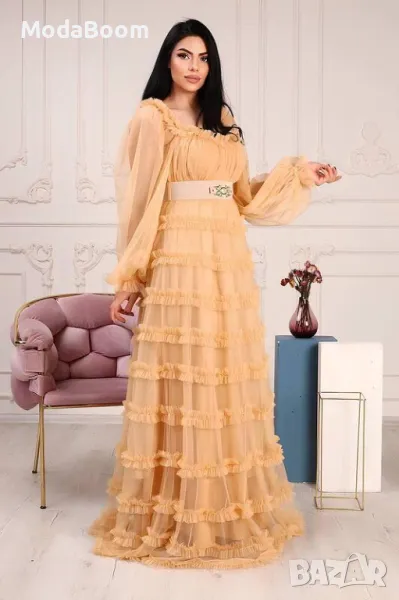 Super sale💯Вечерна рокля с дълги ръкави, деколте и тюл с волани в златисто