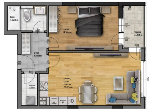 Жилището, което предлагаме за продажба е ДВУСТАЙНО С ИЗТОЧНО ИЗЛОЖЕНИЕ, състои се от дневна с кухненски бокс и трапезария-23,87 кв.м, спалня-14,50 кв.м, баня с тоалетна, входно антре, перално помещение и тераса.Обща площ 73,44 кв.м.