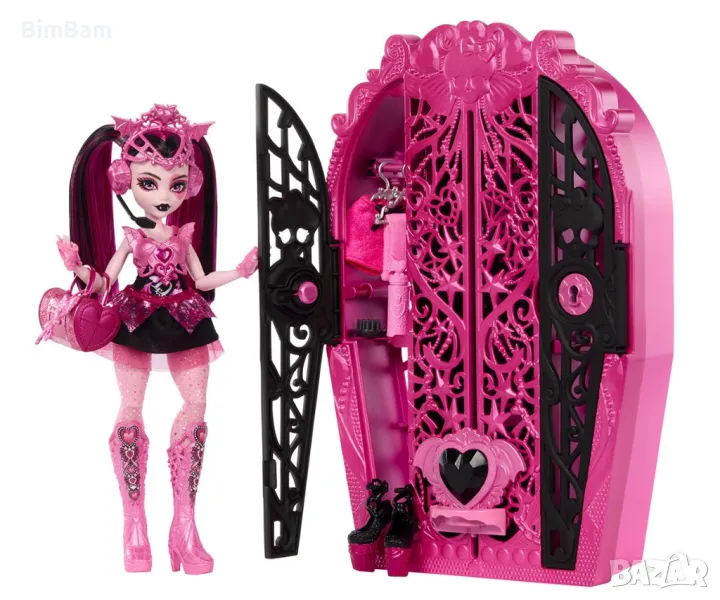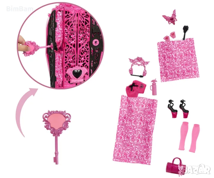 Поставете талисмана в основата на гардероба, след което го плъзнете нагоре като цип, за да разкриете куклата Дракулора в целия й вамптастичен блясък! Повтаряйте разкриването отново и отново за непрекъснато забавление;