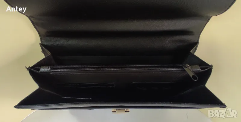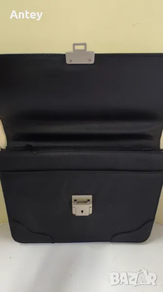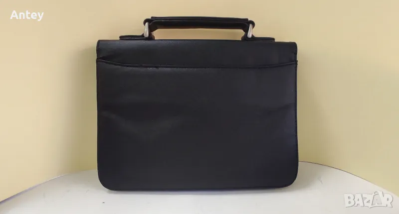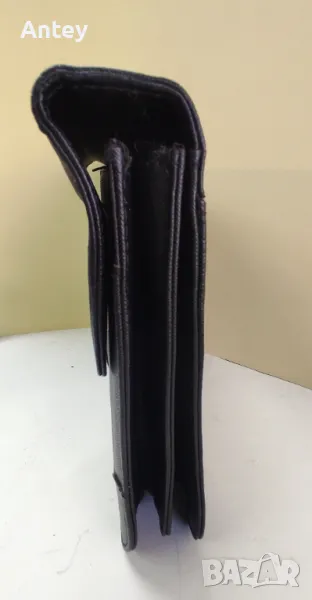 Здрава и стабилна кожена чанта за таблет. Неизползвана. Черна, със сребриста метална закопчалка. Много функционална, с няколко отделения за устройство, документи, аксесоари. Разширява се като хармоника, като в долната част може да достигне 9 - 10 см., в горната - 5 см. Малък, подвижен офис. Ще върши добра работа на бъдещия си притежател.Вътрешни размери: Широчина 28 см., височина – 18 см., странично – до 10 см. Разпределение: Голямо основно отделение, разделено на две с преграда, представляваща джоб с цип. Преден джоб, под капака, заден джоб. Вътре – джоб с цип, в задното отделение, джобчета за телефон и визитки в предното, плюс места за химикалки.Вътрешната част е изцяло подплатена със здрав синтетичен текстил, дръжката е удобна, стабилна, кожена, с метални държачи, сгъваема. Долните ъгли в предната част са усилени с допълнителни