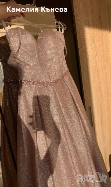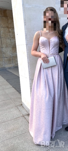 Официална рокля в нежен розов цвят, покрита цялата в брокат.