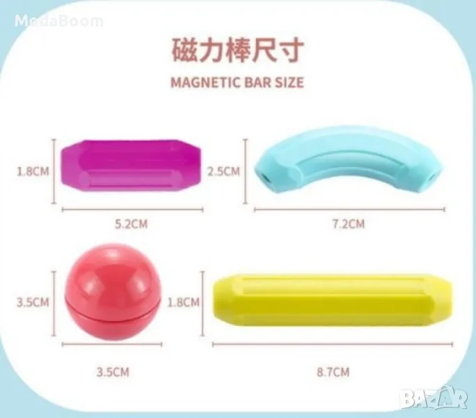 Бебешки комплект играчки - сглобяеми магнитни блокове, различен брой части/ Вариант 1: Комплект от 52 части: 18 броя правоъгълници, 18 броя сфери, 8 броя дъги, 8 броя стикове;/ Вариант 2: Комплект от 128 части: 46 броя правоъгълници, 36 броя сфери, 23 броя дъги, 23 броя стикове;/ Вариант 3: Комплект от 258 части: 126 броя правоъгълници, 82 броя сфери, 22 броя дъги, 26 броя стикове.