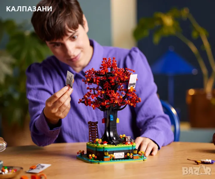 Конструирайте заедно, вдъхнете живот на носталгични спомени и създайте уникална украса на дома с декорацията LEGO® Ideas Родословно дърво (21346). Прекрасен творчески подарък за възрастни, стойката с родословно дърво за конструиране включва 16 висящи държача за показване на малки снимки, съобщения и други хартиени сувенири. Скритото отделение за съхранение в основата на дървото е пълно с аксесоари. Изберете от селекция от сезонна зеленина, поставете играчка самолет и хвърчило в клоните на дървото и добавете 4-те къщички за птици, 2 фигури на птици и филипинска пеперуда. Има и цветя за поставяне върху основата с цвят на трева, плюс много други елементи за персонализиране на идиличната сцена, включително бинокъл, храна, ролкови кънки и лупа. Ще намерите инструкции за построяване „стъпка по стъпка“ в кутията и в приложението LEGO Builder, които ще ви помогнат да се насладите на изискващото внимание, релаксиращо конструиране с тухлички със семейството и приятелите си.