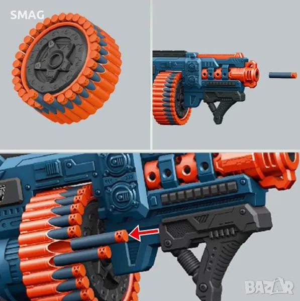 Картечница анихилатор в синьо оранжев цвят с цилиндричен пълнител, който побира 48 дунапренови куршума. Поставете куршумите и започнете играта.