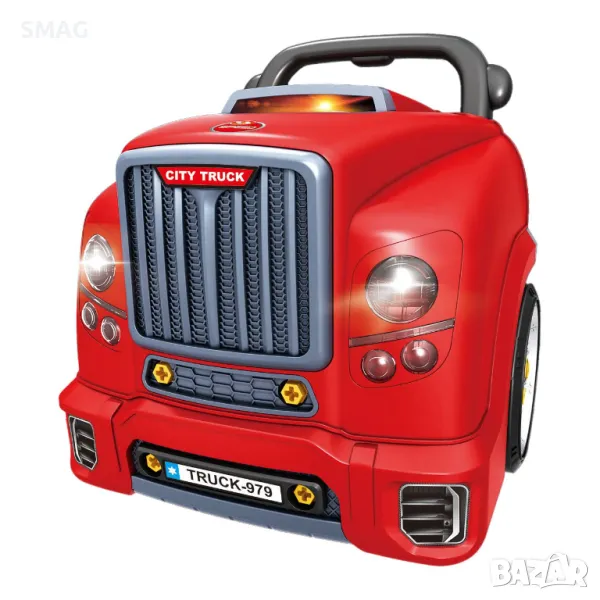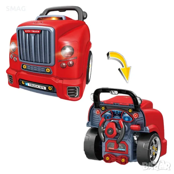 Кутия във формата на камион с волан и място за инструменти Има реалистични звуци при работа, светлини, бутон за стартиране на двигателя и скоростен лост. Има въртящи се части и дръжка за носене. Работи с 3 AA батерии (не са включени).