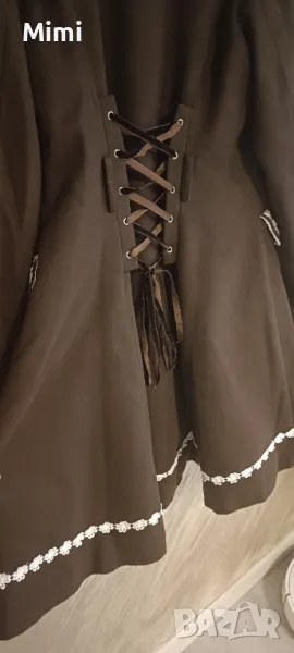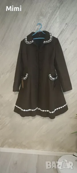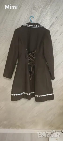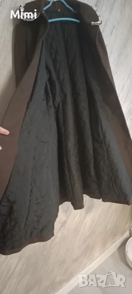 Палтото е разкроена кройка. на кръста има връзки, които регулират талията. Палтото е шито по поръчка, не е носено само е стояло прибрано. От М до XL.Цвят шоколад.