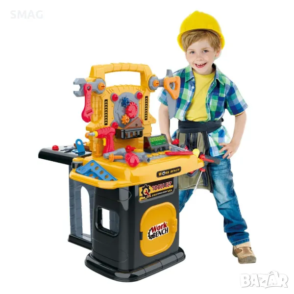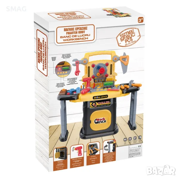 Играчка работна маса с лесно сглобяване. Има музика, реалистични звуци при пробиване, заковаване и рязане. Краката на пейката се движат назад, а дъното има място за съхранение на инструменти, електрическа бормашина и аксесоари. Работи с 3 AA батерии за масата (не са включени) и 2 AA батерии за бормашината (не са включени).