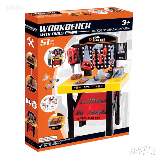 Играчка работна маса с лесно сглобяване. Има 2 нива и много реалистични инструменти за безброй часове творческа игра. Бормашината се управлява ръчно.