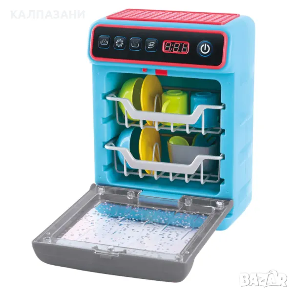 Натисни бутоните в горната част, за да включиш или изключиш миялната машина. Вратичката й се отваря и затваря. Комплектът включва различни прибори и кухненски съдове.