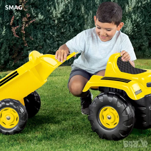 Ходещо превозно средство, жълт трактор с багерна кофа, количка и 4 цветни аксесоара и клаксон (задвижван от помпа под налягане). Има много стикери за залепване отстрани.