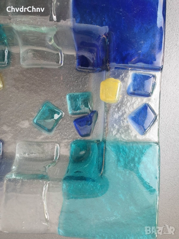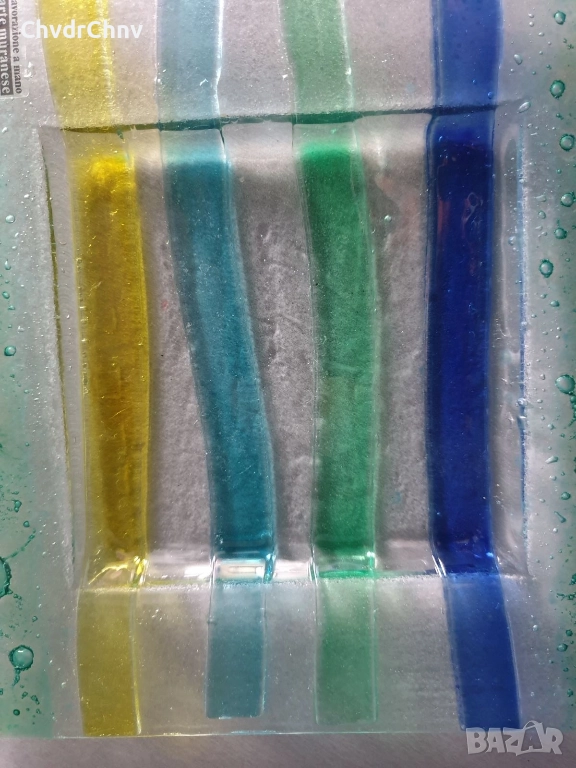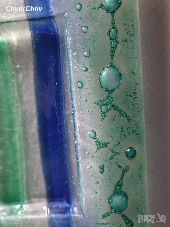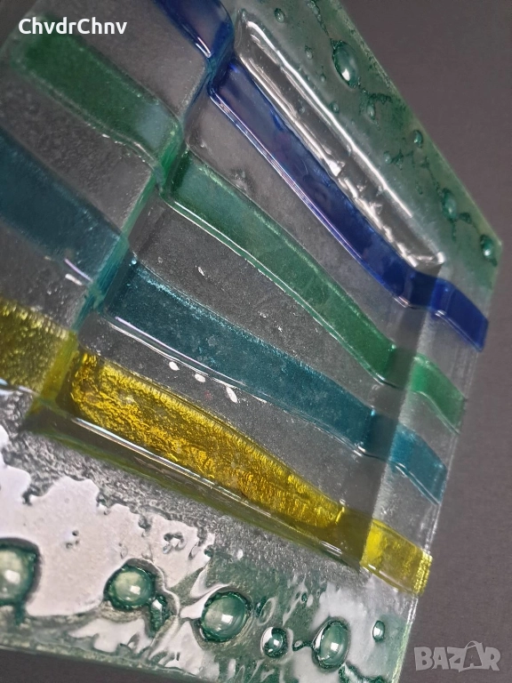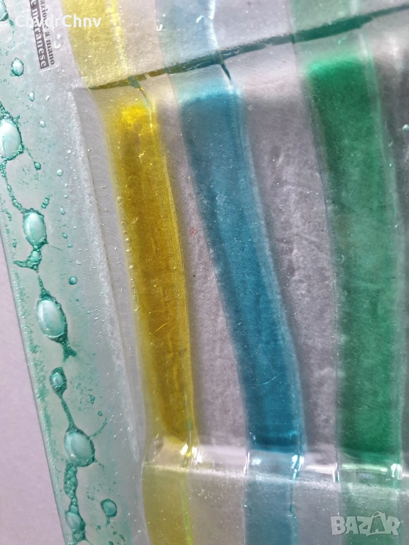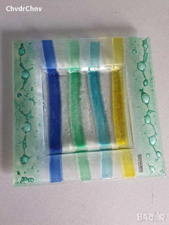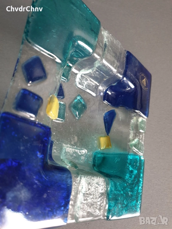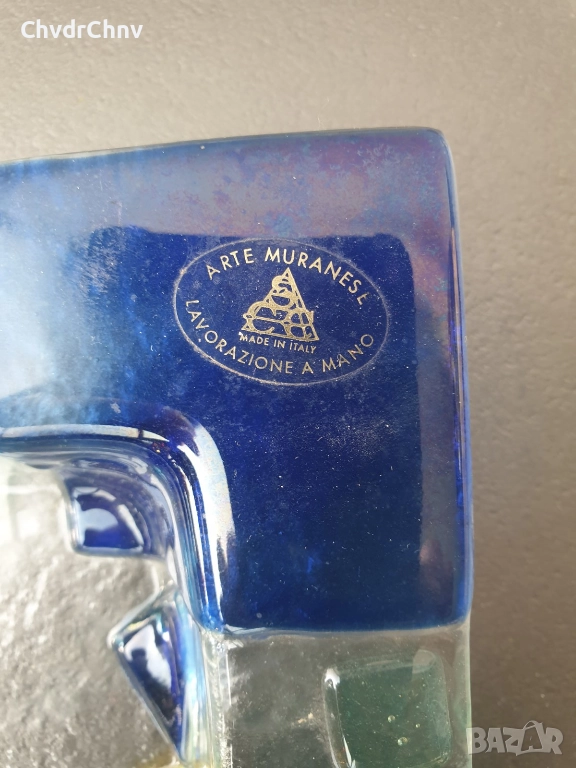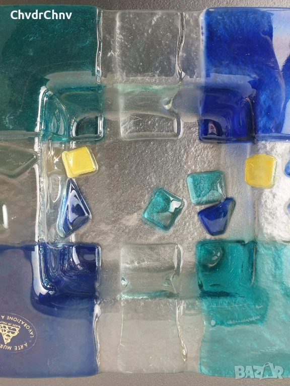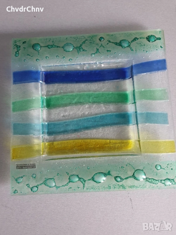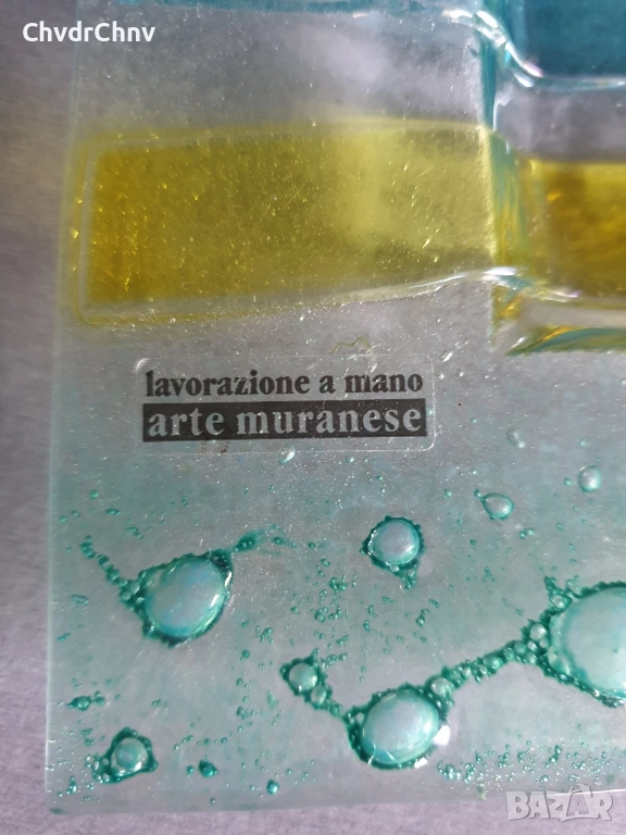 Мурано стъкло в няколко цвята, с маркировки (показани) че са оригинални Мурано и ръчно направени. Повърхността отгоре е гладка, отдолу е релефна.
