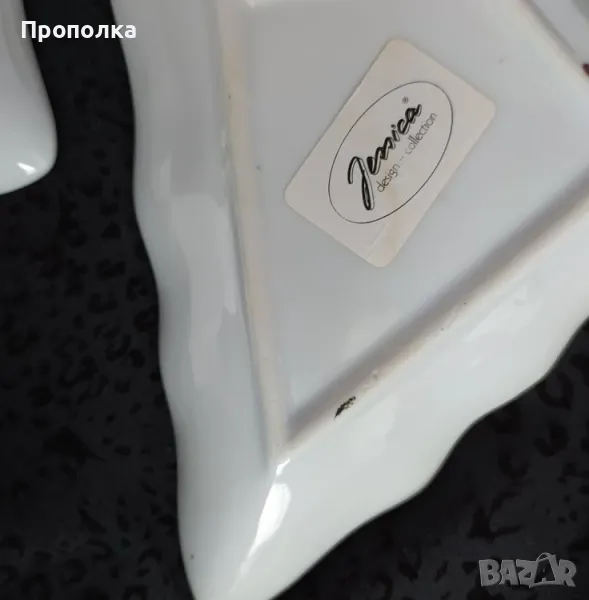 ширина-височина от 9 до 18см. Съдържа :Три чинийки и кошничка.