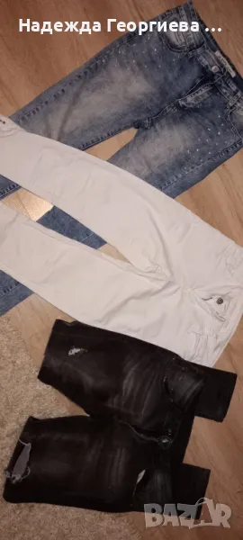 Дънките са три вида и трите модела са тип слим. Всички са еластични. Белите са с ципове отстрани и са $ размер, сините са с камъни много ефектно стоят също са 28 ми размер, а сивите са протрити и са размер 30. С камъните са 15 лв, другите са по 12 лв бр. За повече информация моля обадете се на телефон 0889909195 Надя или на лични.