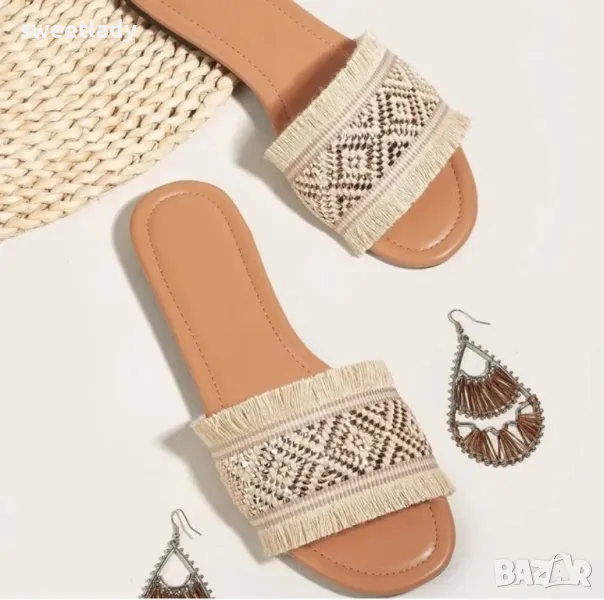 Елегантни чехли със сламена декорация и лека, равна подметка.Съчетават се чудесно с бански, облекла и аксесоари.
